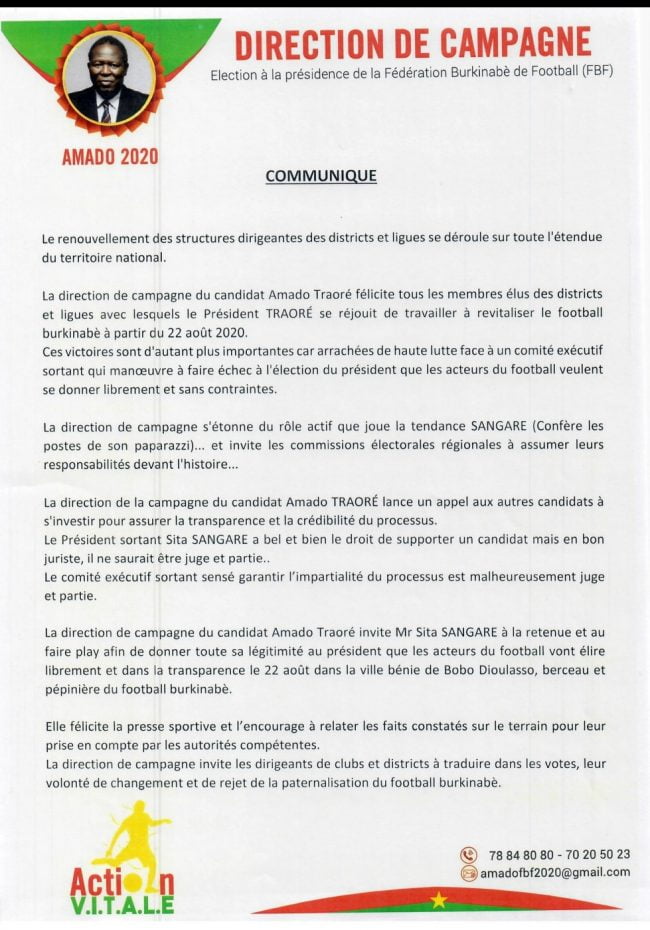 Les 6 ligues régionales restantes connaîtront leurs nouveaux bureaux exécutifs ce weekend (20-20 juin). En prélude à ces consultations électorales, la directeur de campagne du candidat Amado Traoré a rédigé un un communiqué dont nous avons eu copie. En effet au regard de l’enjeu, elle a invité les commissions électorales régionales à « assumer leurs responsabilités devant l’histoire« . Aussi, si elle ne refuse pas le droit au président sortant de la FBF de soutenir un candidat, la direction de campagne n’admet pas que celui-ci soit à la fois « juge et partie« .